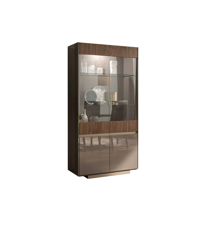 Вітрина CORSO COMO італійської фабрики Alf Italia з двома скляними дверцятами, характеризується вишуканим дизайном завдяки сірому глянсовому оздобленню поверхні і квадратним зігнутої форми ручкам, виконана в стилі модерн.